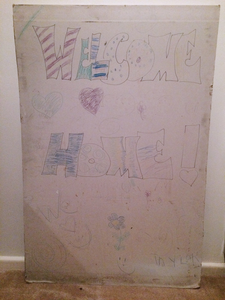 So with my rental car picked up in Houston I made it to Atlanta. By this time I had been gone more than a week away from my family. We talked every day, several times throughout the day. But I still didn’t know how I was getting home. The event was over and I heard that planes were taking off again. But I also heard about 5-hour waits for security and plane cancelations. And I didn’t want to turn my car back in as I feared getting stranded at the airport. I knew the only way I was guaranteed to make it home was if I drove all the way from Atlanta to Bethlehem, PA. And that’s what I did. Houston to Tallahassee – Tallahassee to Atlanta – Atlanta to Bethlehem. I’ll never forget pulling into my driveway and opening the garage door. There in plain sight was a piece of sheetrock scrap left over from all the house remodeling. And on that sheetrock Maggie and Paige had decorated with crayons and colors “Welcome Home”. We went into our bedroom and just lay there on the bed embracing each other and giving each other kisses. There I was only 30 years old with a woman I loved dearly and a daughter that became my own. I didn’t want that moment to stop. And as you can see from the image here, it’s a little worse for wear but I still have the piece of sheetrock to this day. It’s been everywhere with us!