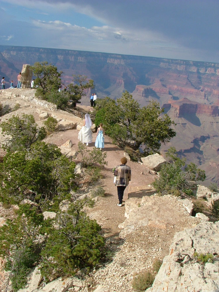 We slowly made our way to Flagstaff to spend the night. From Flagstaff we drove the 80-miles to the Canyon to scope it out. Now when most people go get married at the Grand Canyon they do it very close to the El Tovar Hotel which is the main hotel on the South rim. The problem with this is sight seers are EVERYWHERE and anyone could have stopped and watched. Maggie and I had zero interest in this. But somehow Maggie had found a very private area that was Indian property, and for a small fee we could rent it for the day. This was perfect. It was 5 miles from the El Tovar hotel where we were having the reception, and no one was to be seen. What we saw was a 100 yard long, 20 yard wide spire of land that jutted out into the canyon. And on both sides of this spire… well it was a LONG way down! I still have seen nothing like it. It was perfect. Maggie and I decided we would have the ceremony right at the end with Pastor Jerry performing the ceremony.